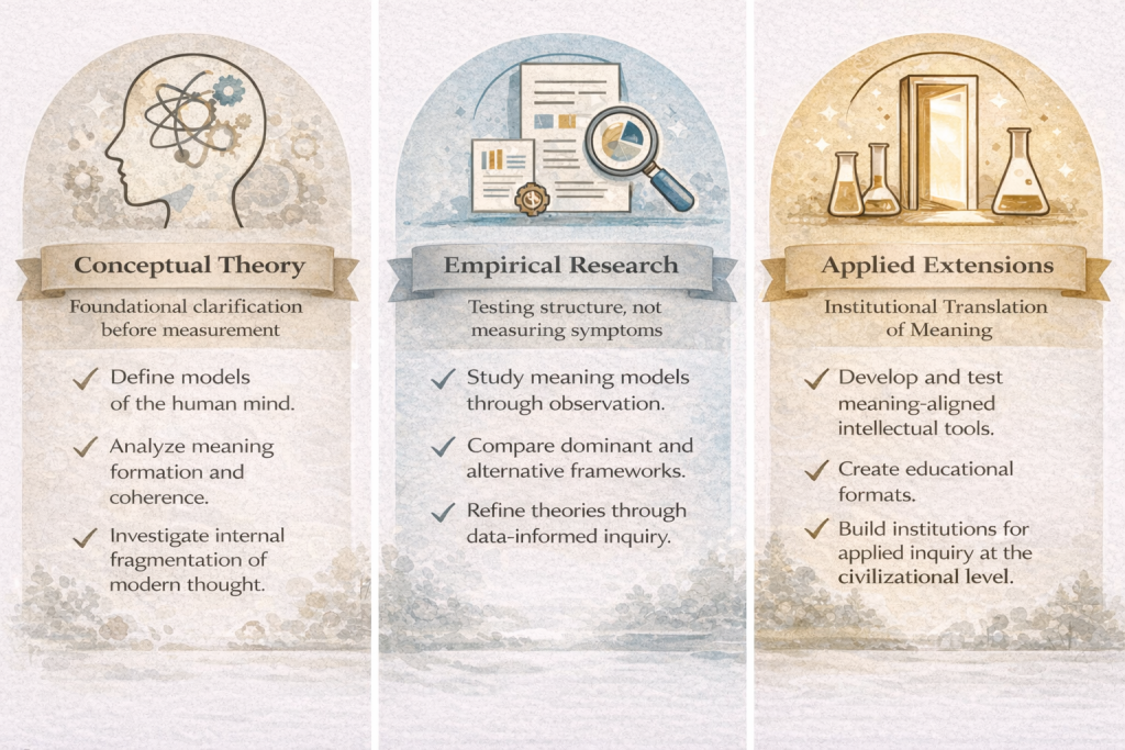 Translate findings into practical tools: educational materials, meaning-aligned technology extensions, and eventually an academy/institutional model. This phase conditional upon the rigor of the first two—will explore practical extensions, including technological tools, educational frameworks, and institutional forms capable of embodying and sustaining coherent mind architectures. Each stage depends on the integrity of the previous one. Progression is methodological rather than chronological, and no stage is bypassed. Institutional forms capable of embodying and sustaining coherent mind architectures at the civilizational level.