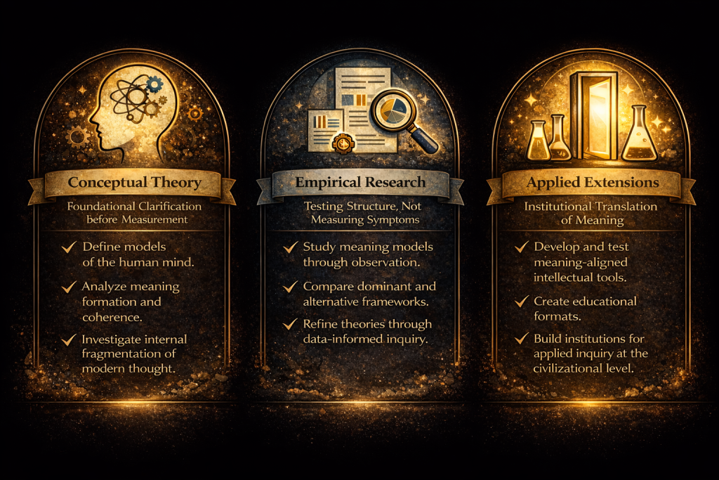 Translate findings into practical tools: educational materials, meaning-aligned technology extensions, and eventually an academy/institutional model. This phase conditional upon the rigor of the first two—will explore practical extensions, including technological tools, educational frameworks, and institutional forms capable of embodying and sustaining coherent mind architectures. Each stage depends on the integrity of the previous one. Progression is methodological rather than chronological, and no stage is bypassed. Institutional forms capable of embodying and sustaining coherent mind architectures at the civilizational level.
